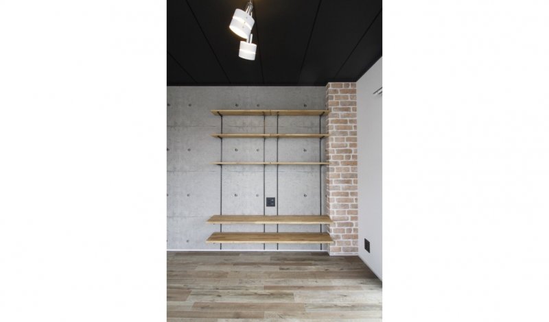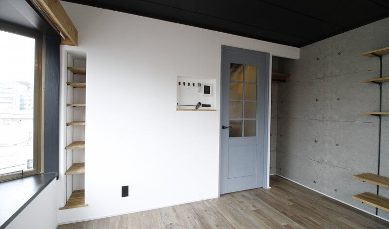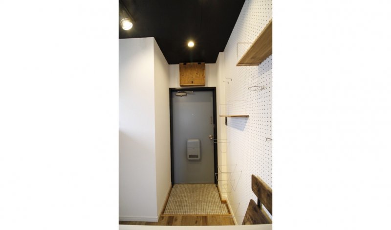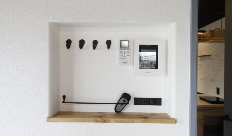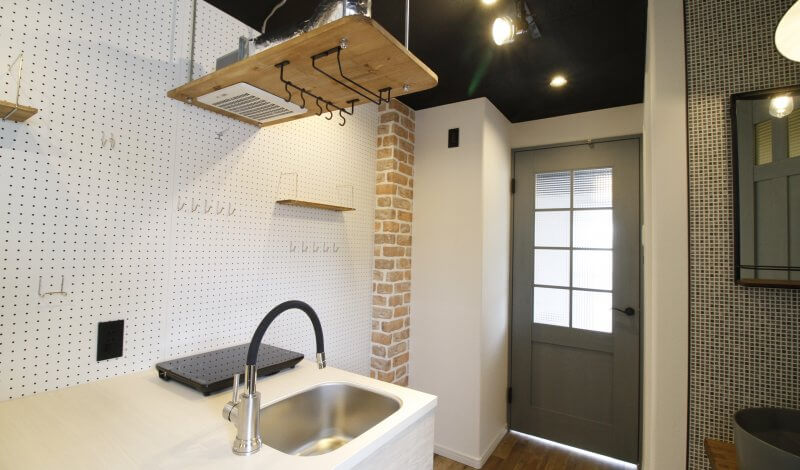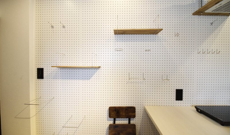 壁一面が有孔ボードになっているので、フックや棚を自在に設置可能です。